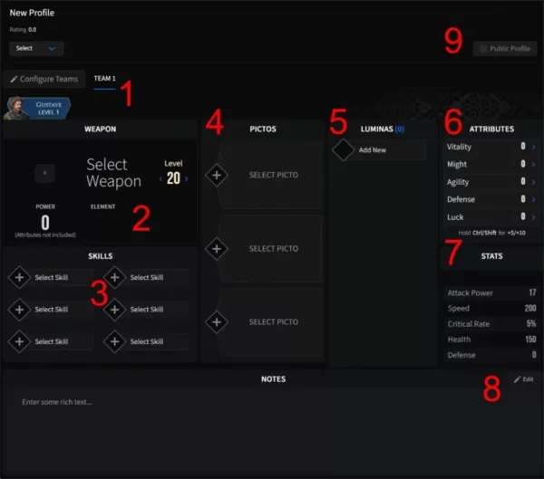 Wählt eure Charaktere aus und bildet eure aktive Gruppe. Ihr könnt auch verschiedene Teams mit einzigartigen Setups für jeden Charakter erstellen. Wählt oben ein optionales Tag wie "Geschichte" oder "Nach der Geschichte". Nutzt diesen Bereich, um zwischen den Charakteren in eurem Team zu navigieren und ihre Ausrüstung zu ändern.Wählt eure Waffe aus und passt ihre Stufe an. Dies aktualisiert die Kraft und Skalierung der Waffe, obwohl die Attributsskalierung derzeit nicht berücksichtigt wird.Wählt die sechs Fertigkeiten aus, die euer Charakter verwenden wird. Hinweis: Verlaufsfertigkeiten sind hier nicht enthalten, aber ihr findet mehr darüber im Kodex!Wählt eure Pictos aus und denkt daran, dass jedes Picto nur einmal im gesamten Team verwendet werden kann. Wählt die entsprechende Stufe, um die von jedem Picto gebotenen Statuswerte zu sehen. Fügt hier Lumina hinzu; die Gesamtpunktzahl wird oben angezeigt.Weist eure Attributspunkte zu, vielleicht mit Fokus auf ein Attribut, mit dem eure Waffe skaliert.Die Statuswerte eures Charakters werden hier angezeigt, berechnet aus euren Pictos, Attributen und dem Grundschaden der Waffe.Fügt Notizen hinzu, um eure Fertigkeitsrotation zu erklären oder wo ihr bestimmte Gegenstände gefunden habt.Stellt euren Build auf öffentlich, um ihn mit der Community zu teilen.